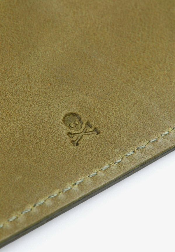 Tarjetero con calavera y logo grabado.
