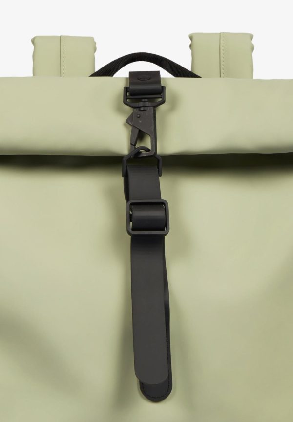 - Cierre enrollable con botón a presión y mosquetón característico.