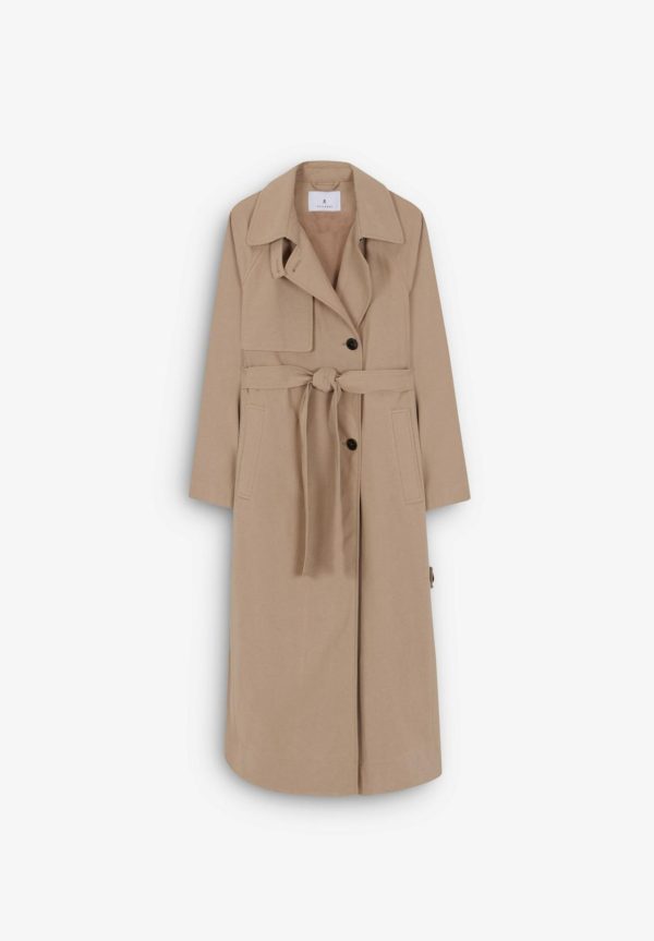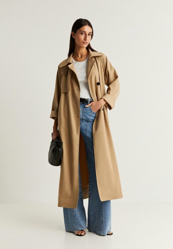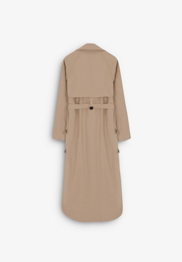 Gabardina tipo trench con detalle de aberturas laterales con botones.