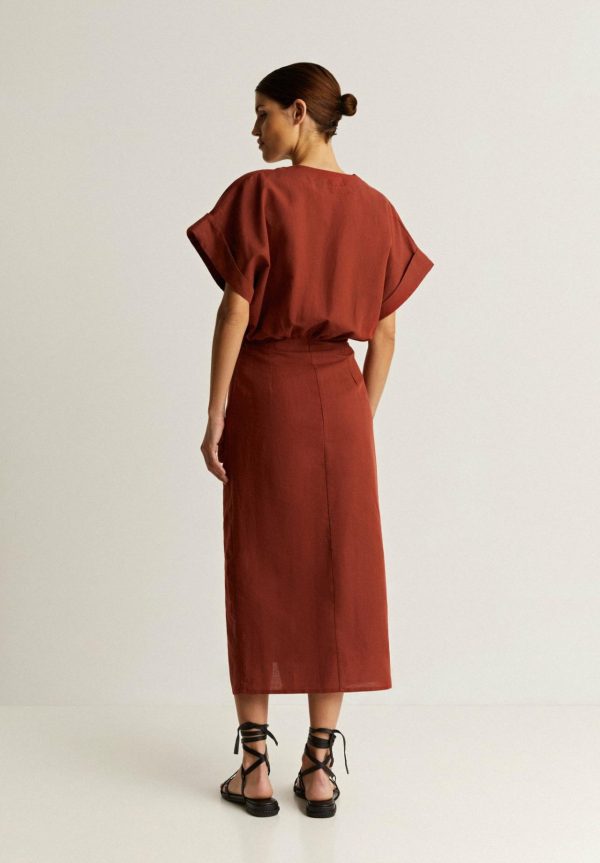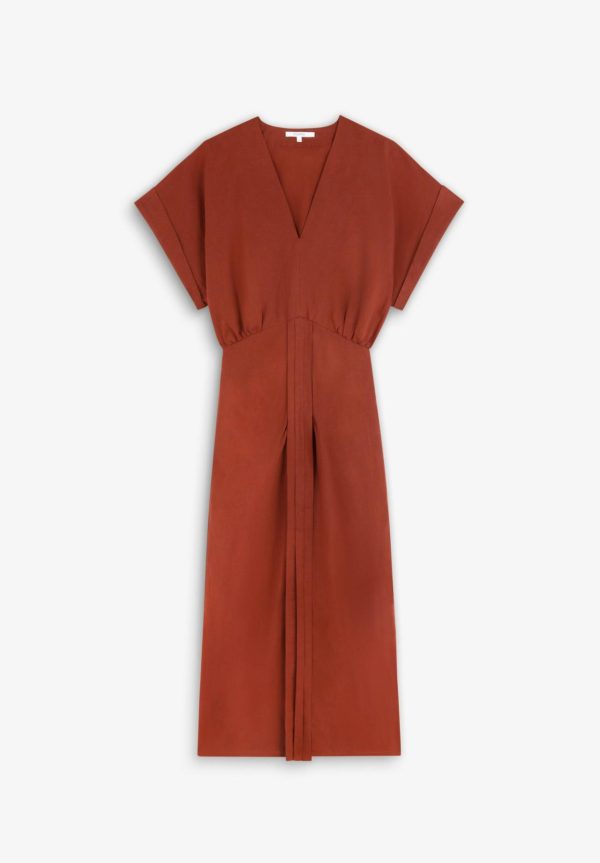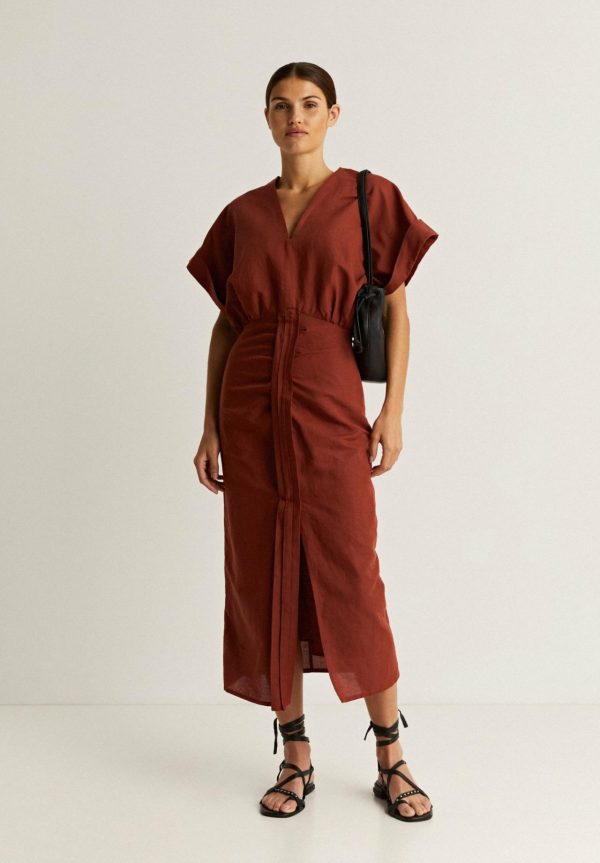 Vestido midi con detalle de frunce frontal.