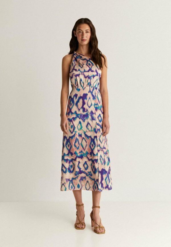 Vestido midi con print. Confeccionado en tejido fluido. Corte Regular fit. Escote asimétrico. Manga tirante con detalle de nudos. Abertura en espalda. Abertura en bajo.